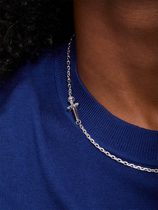Elevate your style with the Sterling Silver Sword Chain Necklace, a piece that seamlessly blends function and design. The star of this necklace is its unique sword-shaped clasp, a symbol of strength and sophistication, expertly crafted in polished sterling silver. The sleek chain complements the bold clasp, making it a versatile piece for everyday wear or a statement accessory for special occasions. A perfect fusion of artistry and practicality, this necklace is a standout addition to your collection.
