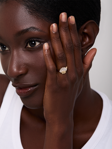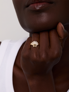 This luminous 14kt yellow gold ring features a sculpted Venus shell motif, fully adorned with pavé diamonds that follow the shell’s natural ridges in a radiant fan-like formation. With its elegant profile and commanding presence, this piece reimagines the traditional signet ring through the lens of goddess-inspired design.