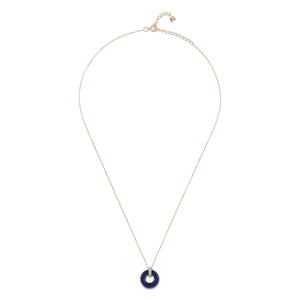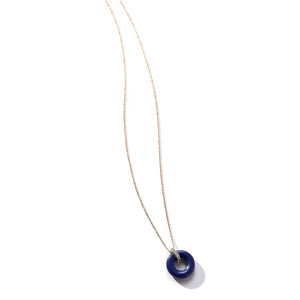 A refined play of color and form, this necklace reimagines simplicity through an artful lens. Crafted in 14kt yellow gold, it features a perfectly polished lapis donut pendant—a symbol of harmony and timeless elegance. The deep blue stone is suspended from a pavé diamond “door knocker” bail, adding a touch of brilliance that beautifully contrasts the rich hue of the lapis.