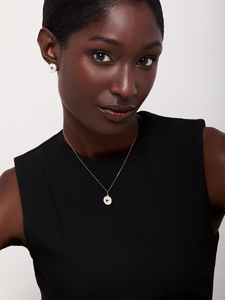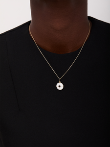A celebration of soft radiance and subtle sparkle. This elegant necklace features a smooth Mother of Pearl donut set in 14kt yellow gold, encircling a delicate inner ring of pavé-set diamonds. The gentle shimmer of the Mother of Pearl contrasts beautifully with the brilliance of the diamond circle, creating a refined interplay of texture and light. Suspended from a fine gold chain, this piece adds a quiet sophistication whether worn solo or layered.