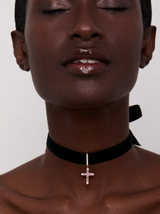 This choker combines refined elegance with a touch of bold allure. A supple black velvet ribbon is finished with a 14kt gold and diamond bail, suspending a luminous cross pendant set with vibrant pink sapphires and accented by delicate diamond tips. Designed to tie gracefully at the neck, it offers both comfort and an adjustable fit.