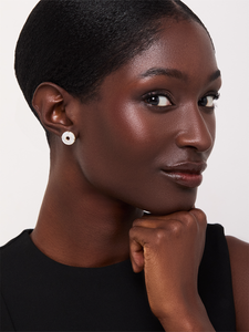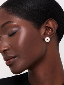 Refined and radiant, these studs feature lustrous mother of pearl donuts—symbols of harmony and balance—accented by pavé diamond inner circles that catch the light with subtle brilliance. Set in 14kt yellow gold, the interplay of soft iridescence and sparkle creates a look that’s both timeless and quietly striking.